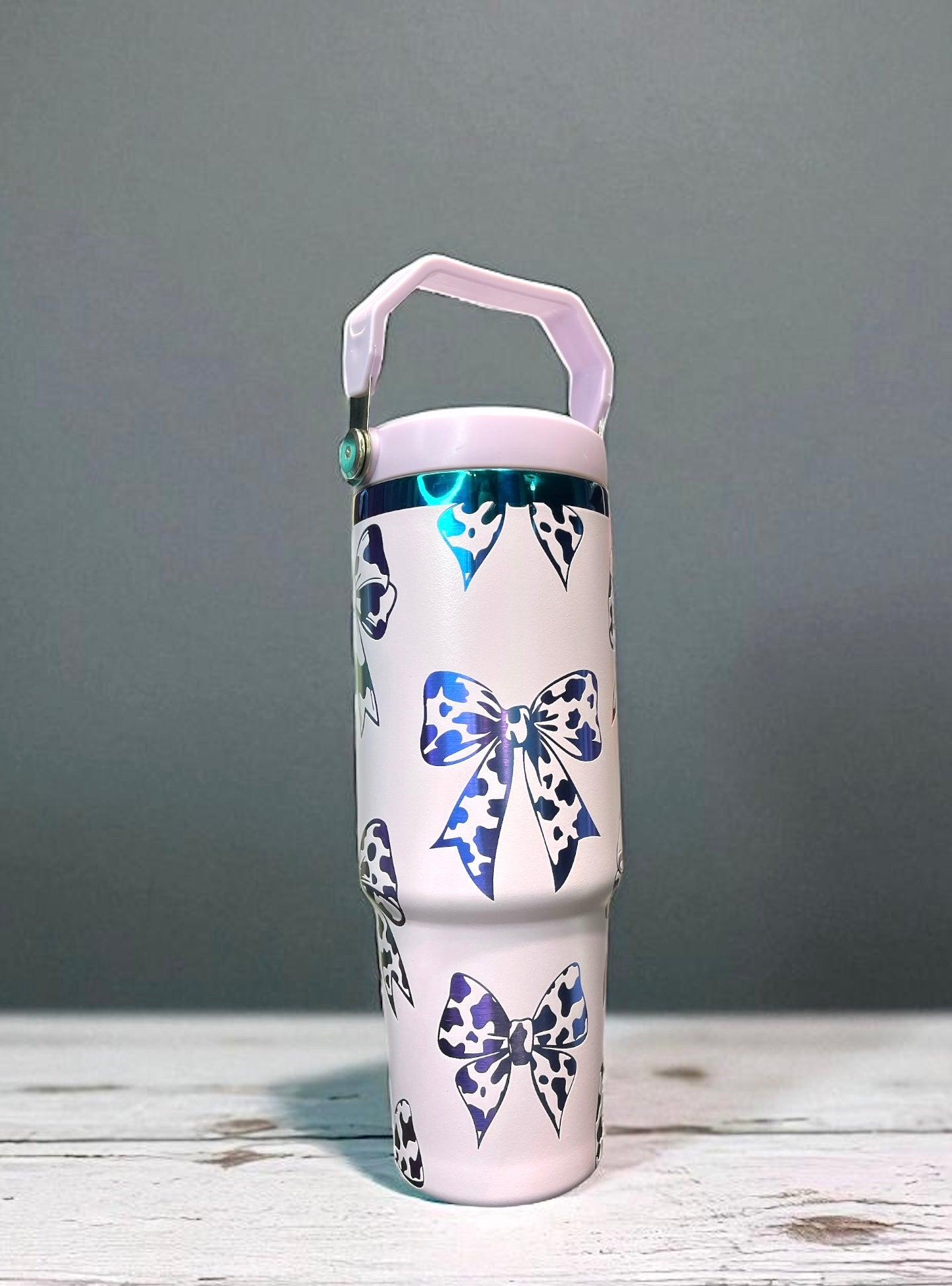 Stay stylish and hydrated with our 30 oz Cowhide Bows Light Purple to Iridescent tumbler. The cow print design adds a fun touch, while the double-wall insulation keeps your drink at the perfect temperature. Take it on-the-go for a fashionable and functional accessory.