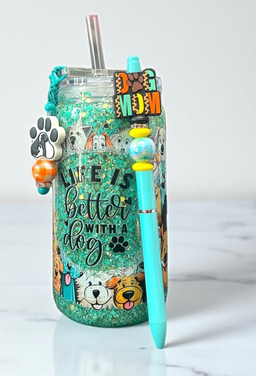 Enhance your love for dogs with our "Life is Better with a Dog" set. Featuring a charming snowglobe, a stylish dog mom pen, and a cute straw charm, this set is perfect for any dog enthusiast. Enjoy the benefits of a joyous reminder of your beloved pet in everyday items.